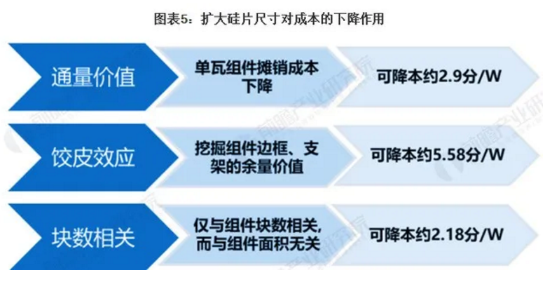 隨著硅片尺寸的擴大,新型組件可以通過增加少量的硅片成本,獲得更高的組件端成本節(jié)約,進而提升大尺寸組件的產品競爭力。其降本機理為: