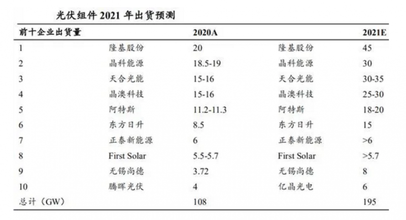全球組件產能擴張迅速。據(jù)預測,2021 年全球光伏裝機量預計在 160~170GW 左右,以 1:1.2 容配比計算,對應的組件總需求預計約為 192~204GW, 這意味著頭部企業(yè)的市占率目標將超過 90%。根據(jù) BNEF 數(shù)據(jù),2020 年全球 Tier 1 組件產能約為 220GW,同比增長 31.7%。根據(jù) PV Infolink 及公司公告數(shù)據(jù)統(tǒng)計, 2021 年組件廠商產能預計約為 300GW,同比+33.76%,各家產能擴張迅速。