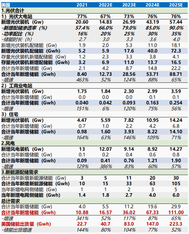 隨著多地儲(chǔ)能政策不斷出臺(tái)及市場(chǎng)機(jī)制日益完善,美國(guó)工商業(yè)儲(chǔ)能市場(chǎng)將逐步增長(zhǎng)。綜上,預(yù)計(jì)2023年美國(guó)儲(chǔ)能市場(chǎng)總需求為36GWh,對(duì)應(yīng)出貨量為83GWh,裝機(jī)/出貨同增117%/104%,到2025年裝機(jī)/出貨需求為111GWh/223GWh,2022-2025年裝機(jī)/出貨CAGR分別為88.5%/76.4%。