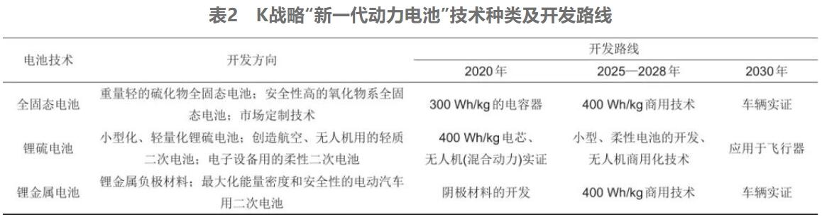 圍繞下一代動力電池技術(shù),韓國政府將拉動公私合作,支持大規(guī)模電池研發(fā)。K戰(zhàn)略中,韓國政府對研發(fā)路線進行了規(guī)劃,主要圍繞新一代電池制造技術(shù)以及實現(xiàn)全固態(tài)電池、鋰硫電池、鋰金屬電池的商用化,如表2所示。