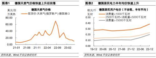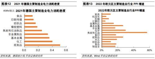 德國電力消耗密集型行業(yè)主要是紙制品、化工、基本金屬和非金屬制品等,也是工業(yè)品價格通脹較嚴重的行業(yè)。將行業(yè)電力消耗規(guī)模比上行業(yè)總產(chǎn)出,可以得到該行業(yè)的電力消耗密集度。德國紙制品行業(yè)的電力密集程度較高,每1歐元的產(chǎn)出需要投入0.51KWh的電力,化工、基本金屬和非金屬制品行業(yè)的電力密集度分別為0.4、0.36和0.33KWh/歐元。使用歐元區(qū)主要制造業(yè)PPI同比增速來衡量德國制造業(yè)的通脹形勢,可以看到2022年P(guān)PI同比最高的是焦炭和石油行業(yè),漲幅高達56.7%;電力消耗密集度較高的紙制品、化工、基本金屬和非金屬制品行業(yè)通脹程度也較高,其PPI同比分別為26.6%、29.9%、26.6%和16.7%。
