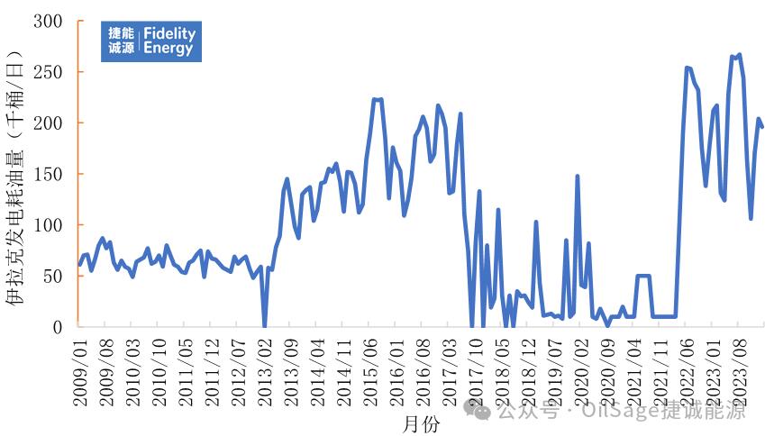 由于天然氣發(fā)電量不足,伊拉克發(fā)電耗油量從2021年的2.4萬(wàn)桶/日上升到2022年的14.9萬(wàn)桶/日。2022年伊拉克報(bào)告的發(fā)電燃油總量大幅上升至約36萬(wàn)桶/日,并在2023年6月創(chuàng)下53.5萬(wàn)桶/日的歷史新高。