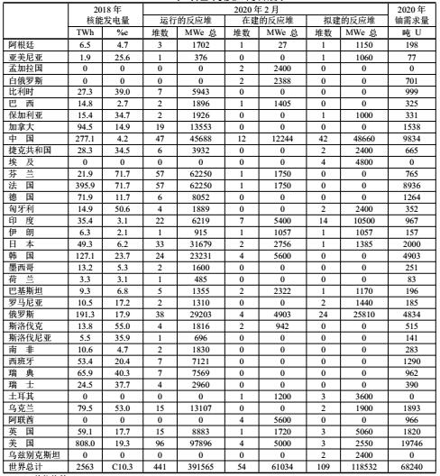 本數(shù)據(jù)是世界核能協(xié)會(huì)(World Nuclear Association,WNA)于 2020年2月份提供的數(shù)據(jù)。