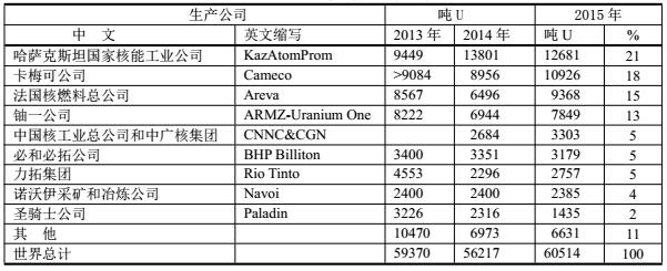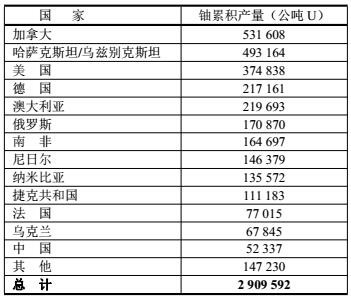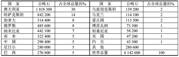 世界約76%從鈾礦生產(chǎn)的鈾是來自哈薩克斯坦、加拿大、澳大利亞和納米比亞。其中哈薩克斯坦鈾生產(chǎn)占世界的比例最大,供應(yīng)世界的40.6%,其次是加拿大(13.1%)和澳大利亞(12.2%)。中國鈾產(chǎn)量較少,鈾生產(chǎn)居世界第8位,占世界總量的3.5%。