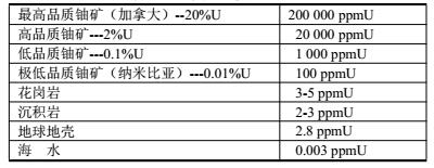 鈾在土壤、巖石及河流、海洋都可發(fā)現(xiàn);甚至在人體和食品中都有痕跡量存在。但是濃縮的鈾礦卻只在很少的地方發(fā)現(xiàn),一般是在堅(jiān)硬的巖石中,如在地殼中占60%的花崗巖中,其鈾含量可達(dá)百萬分之四。