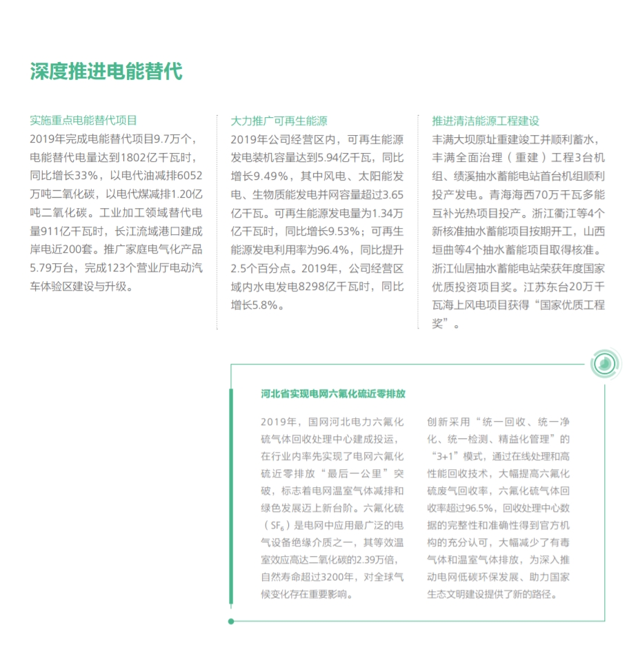 在努力做綠色發(fā)展的表率方面,國家電網(wǎng)有限公司認(rèn)真貫徹落實(shí)綠色發(fā)展理念,全力推進(jìn)生態(tài)文明建設(shè),推動能源更高質(zhì)量、更可持續(xù)發(fā)展,以綠色低碳高效的充足電能,全力服務(wù)美麗中國建設(shè)。2019年經(jīng)營區(qū)新增新能源并網(wǎng)容量3405萬千瓦,新能源并網(wǎng)容量累積達(dá)到34842萬千瓦,同比增長16.1%,新能源云平臺接入新能源場站55萬余座、裝機(jī)容量2.3億千瓦,累計(jì)交易額754.3億元,帶動產(chǎn)業(yè)鏈上下游3000余家企業(yè)協(xié)同發(fā)展;完成電能替代項(xiàng)目9.7萬個,電能替代電量達(dá)到1802億千萬時,“煤改電”配套電網(wǎng)建設(shè)惠及19684個村、372萬戶居民,以電代油減排二氧化碳6052萬噸,以電代煤減排二氧化碳1.20億噸;智慧車聯(lián)網(wǎng)平臺累計(jì)接入充電樁43萬個,充電量達(dá)14.82 億千瓦時,同比增長73.86%。