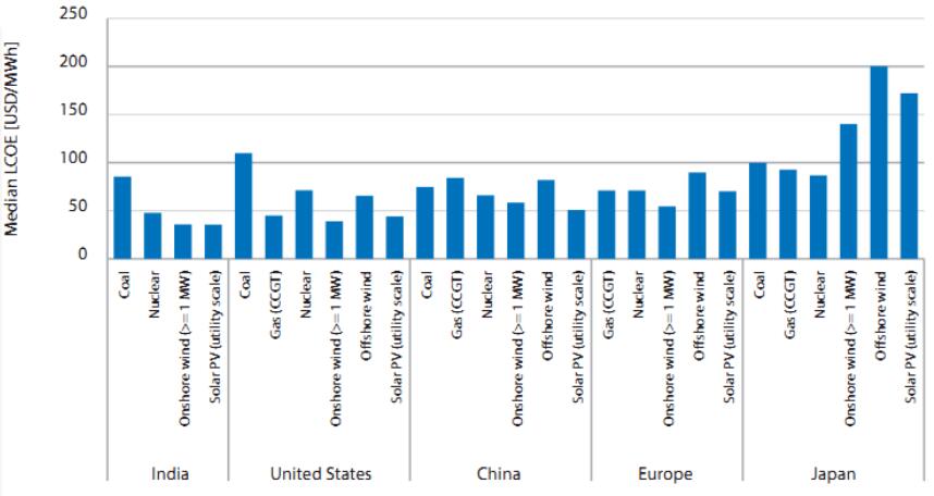 在中國和印度,風(fēng)電和光伏等間歇性可再生能源的平均平準(zhǔn)化發(fā)電成本最低,兩國的公用事業(yè)規(guī)模的太陽能光伏發(fā)電和陸上風(fēng)電成本最低。核電也具有競爭力,這表明兩國都擁有從當(dāng)前仍然高度碳密集的發(fā)電中轉(zhuǎn)型到低碳發(fā)電的基礎(chǔ)。