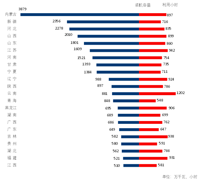 圖3 1-4月份風(fēng)電裝機(jī)較多省份風(fēng)電裝機(jī)容量和設(shè)備利用小時