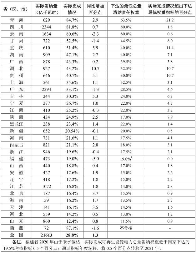 根據(jù)《國(guó)家發(fā)展改革委 國(guó)家能源局關(guān)于印發(fā)各省級(jí)行政區(qū)域2020年可再生能源電力消納責(zé)任權(quán)重的通知》(發(fā)改能源〔2020〕767號(hào))公布的2020年各省(區(qū)、市)可再生能源電力消納責(zé)任權(quán)重,綜合考慮各省本地生產(chǎn)、本地利用以及外來電力消納情況,經(jīng)核算,除西藏免除考核外,全國(guó)30個(gè)省(區(qū)、市)都完成了國(guó)家能源主管部門下達(dá)的總量消納責(zé)任權(quán)重和非水電消納責(zé)任權(quán)重。