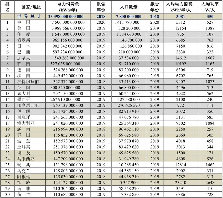 中國人口約占全球的18%,2020年中國電力消費量約占全球總量的32%;盡管中國人均電力消費和人均功率均高于世界平均水平,但仍然低于美國。本數(shù)據(jù)是根據(jù)國際能源署(IEA)的報告。