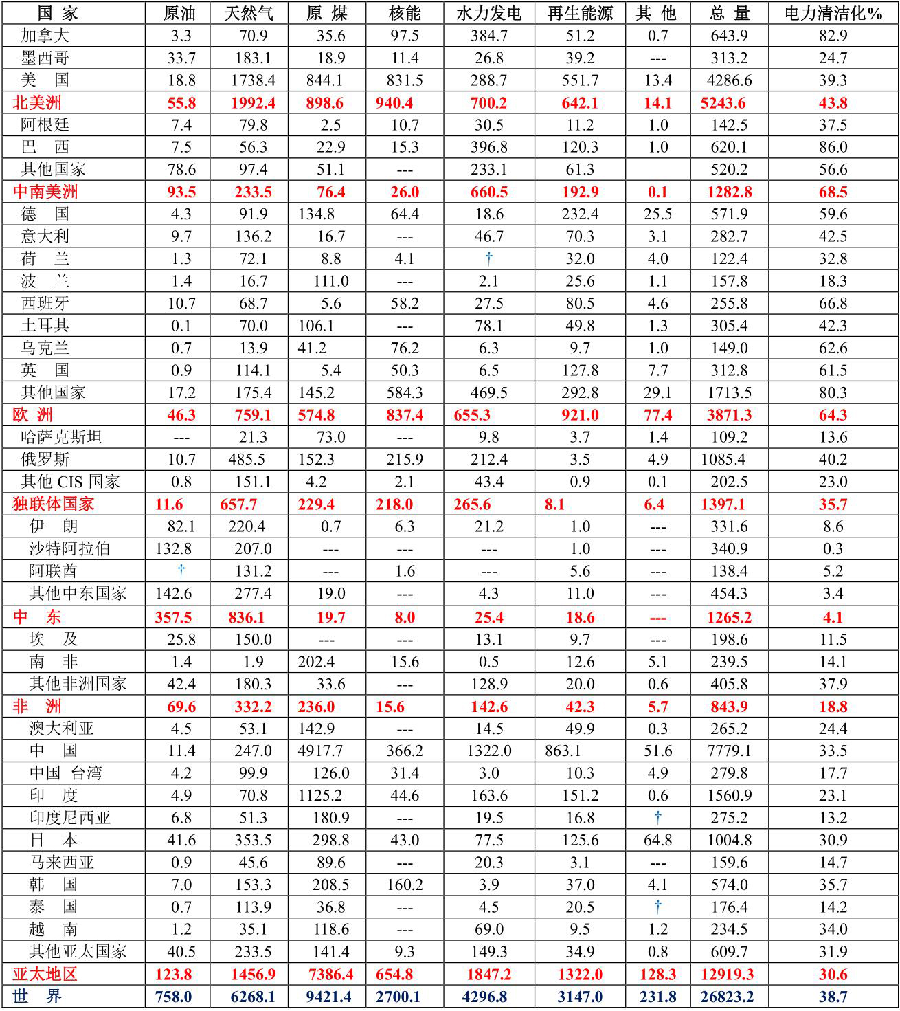 從表中可以看出:全球電力清潔化程度平均值為38.7%;電力清潔化程度最高的地區(qū)是中南美洲達68.5%;電力清潔化程度最高的國家是巴西(86%)、加拿大(82.9%)。