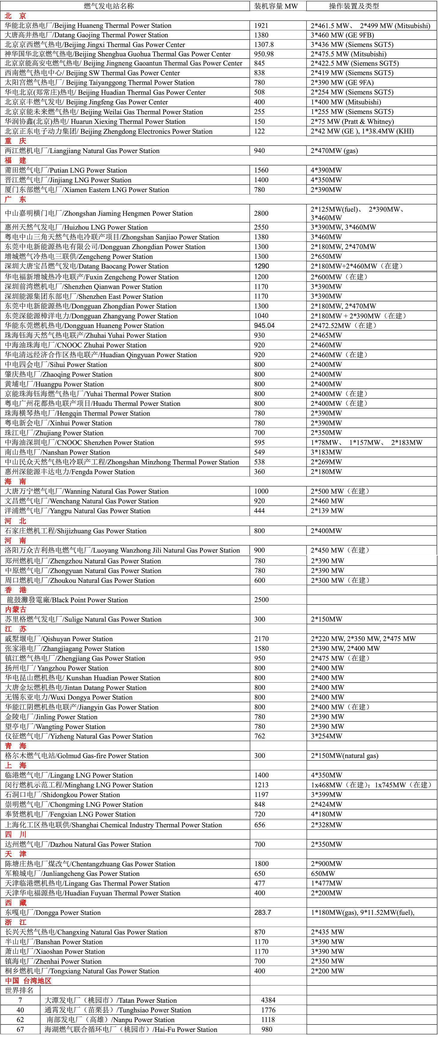 中國最大的燃?xì)獍l(fā)電站在中國臺灣地區(qū)—大潭發(fā)電廠(Tatan Power Station),其次是香港—龍鼓灘發(fā)電廠(Black Point Power Station)。