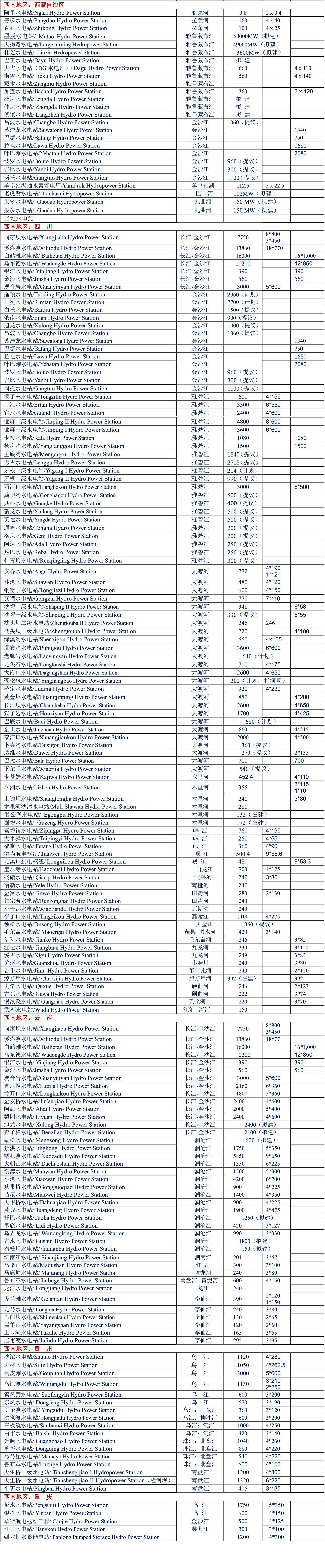 梯級(jí)水電站是世界上發(fā)展水力發(fā)電的一個(gè)重要的獲取電力的方式。在制作下表時(shí),我把相同一河流的水電站歸納在一起,您可以看出,中國(guó)許多河流都有梯級(jí)水電站。