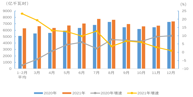 圖1 2020、2021年分月全社會(huì)用電量及其增速