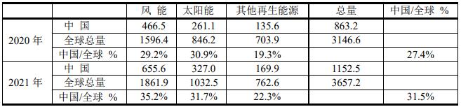⒅ 在再生能源中風(fēng)電場(chǎng)和光伏發(fā)展得最快,其價(jià)格已被用戶接受。根據(jù)BP 2022年報(bào)告,得出下表。中國(guó)風(fēng)能和光伏發(fā)電發(fā)電進(jìn)展迅速,2021年中國(guó)占全球總量的27.4%,而同期美國(guó)為17.1%.
