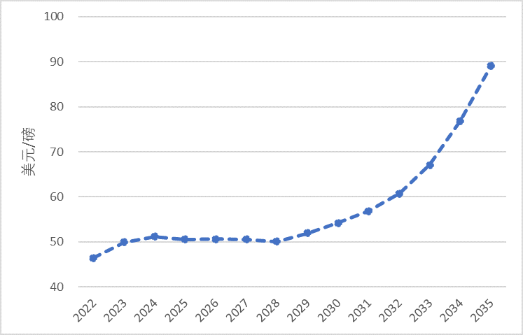 2022-2035年天然鈾年度現(xiàn)貨價(jià)預(yù)測(cè)