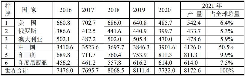 全球原煤可采儲量前6位國家的產(chǎn)量(單位:百萬噸)