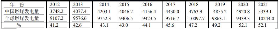 中國占全球燃煤發(fā)電的比例(單位:TWh)