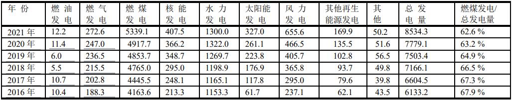 根據(jù)中國國家統(tǒng)計局的數(shù)據(jù),列出下表??梢匀菀卓闯?,中國能源是以燃煤發(fā)電為主。中國燃煤發(fā)電量占中國發(fā)電總量的百分比在逐年降低。