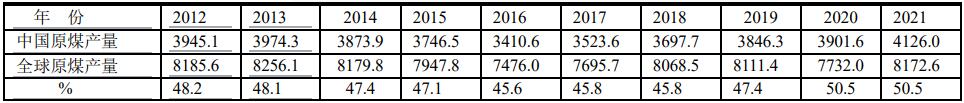 中國原煤產(chǎn)量占全球原煤產(chǎn)量的比例(單位:百萬噸)