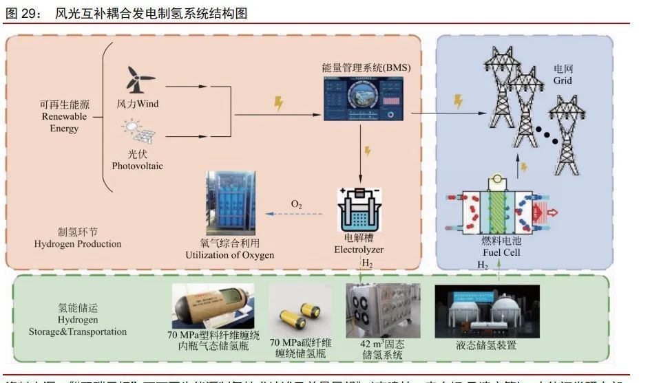 我們預(yù)計2023年在政策的推動下,綠氫項目將從示范項目逐步向商用拓展。在“雙碳”目標(biāo)的減碳場景下,綠氫有豐富的應(yīng)用場景。一方面可以與新能源電站配合,發(fā)揮氫能儲能的作用。另一方面,在工業(yè)領(lǐng)域,氫能也可以作為減碳的工具。工信部發(fā)布的《“十四五”工業(yè)綠色發(fā)展規(guī)劃》明確提到了推進“綠氫開發(fā)利用”等新型污染物治理技術(shù)裝備基礎(chǔ)研究,以及在煉化工業(yè)中推廣“綠氫煉化等綠色低碳技術(shù)”。我們預(yù)計隨著綠氫成本的不斷降低和供給的不斷增加,2023年綠氫需求將有顯著擴張,主要增量來自于化工企業(yè)和工業(yè)領(lǐng)域大型國企減碳的示范項目。綠氫項目的增加有望直接帶動對電解槽的采購需求,我們預(yù)測2023年電解槽需求量有望達到3GW的規(guī)模,對應(yīng)市場空間在50~60億元,有望成為除 FCEV之外的氫能第二大子行業(yè)。