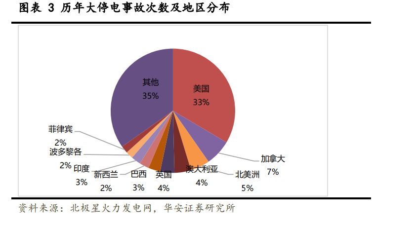 新能源發(fā)電設(shè)備在過程中,外部環(huán)境不能確保設(shè)備可以持續(xù)穩(wěn)定發(fā)電,存在一定的 隨機(jī)性。儲能系統(tǒng)可以對隨機(jī)性、間歇性和波動性的可再生能源發(fā)電出力進(jìn)行平滑控制, 從源頭降低波動性,滿足可再生能源并網(wǎng)要求,為未來大規(guī)模發(fā)展應(yīng)用打好基礎(chǔ)。全球 范圍內(nèi)具有突發(fā)性、影響范圍超過 10 萬人、停電時(shí)長>1h 的大停電事故屢屢發(fā)生,美 國、加拿大、澳大利亞、巴西、印度等國家大停電事故發(fā)生次數(shù)最多,普遍具有國土面 積遼闊、供電跨度大、電力運(yùn)行工況復(fù)雜的特點(diǎn)。北美電網(wǎng)系統(tǒng)設(shè)施老舊,亞非拉地區(qū) 缺乏強(qiáng)大電力設(shè)施建設(shè)投入,導(dǎo)致斷電、缺電現(xiàn)象頻發(fā),疊加氣候變暖、寒潮、龍卷風(fēng)、 高溫干旱等極端氣候多發(fā),當(dāng)?shù)鼐用駥o急備電需求屬于剛需。戶用家儲在電廠事故或 者極端自然災(zāi)害事件中提供應(yīng)急電源,提高用電穩(wěn)定性。全球分布式光伏和戶用家儲仍 處于低水平起步階段,大部分地區(qū)光儲滲透率在 10%以下,發(fā)展空間大。