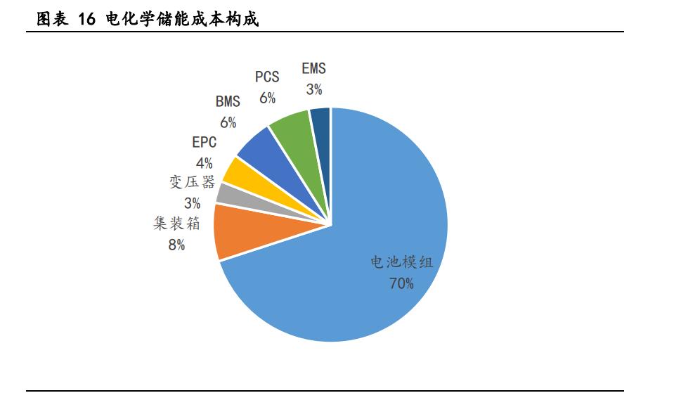 儲能電池系統(tǒng)由電池組和電池管理系統(tǒng)兩部分組成。電池組是整個儲能系統(tǒng)中成本 占比最高的部分,約占 70%,BMS 占比為 6%,儲能電池系統(tǒng)占電化學(xué)儲能成本比重達(dá) 76%。