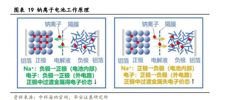 鈉電池組成結(jié)構(gòu)、工作原理與鋰電池相似。鈉電池是一種新型二次電池,其組成結(jié) 構(gòu)與鋰電池相似,主要包括正極材料、負(fù)極材料、電解液和隔膜。鈉電池主要通過 Na+ 在電池正負(fù)極之間來回的脫出和嵌入來實現(xiàn)充放電過程。在充電時,Na+從正極材料脫出, 經(jīng)過電解液和隔膜嵌入到負(fù)極材料,此時,外電路中電子從負(fù)極流向正極。鈉電池放電 過程與充電過程相反。鋰電池則是通過 Li+在電池正負(fù)極之間來回的脫出和嵌入來實現(xiàn) 上述過程,因此兩者工作原理相似,均被稱為“搖椅式電池”。