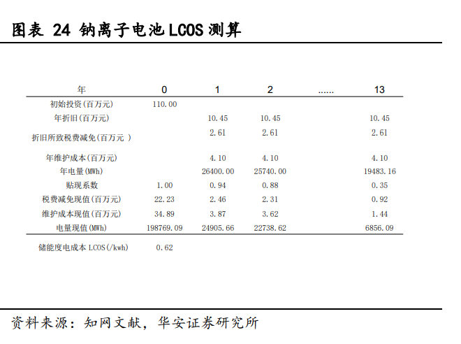 鈉離子電池儲能全壽命儲能度電成本(LCOS)測算核心假設(shè): 初始投資成本:當(dāng)前鋰離子產(chǎn)業(yè)化正在推進(jìn)中,假設(shè)成熟時期可比鐵鋰電池低 20- 30%。目前成本約 370 元/kWh, 而且隨著產(chǎn)業(yè)鏈成熟,材料成本有望進(jìn)一步下探,結(jié)合 結(jié)構(gòu)件好電氣件成本,初始容量投資有望控制在 500-700 元/kWh。 年度運(yùn)維成本:每年需要 3.7%左右,為 0.04 元/W。 壽命:可循環(huán) 2000 次以上,中科海鈉、寧德時代等表示其產(chǎn)品可達(dá) 3000 次,隨 著研發(fā)持續(xù)投入和技術(shù)迭代,電池循環(huán)壽命有望突破 8000 次以上。 循環(huán)效率:可以達(dá)到 84-90%。 貼現(xiàn)率:考慮到當(dāng)前央企能源企業(yè)的融資成本在 4-5%,取 6%作為折現(xiàn)率。