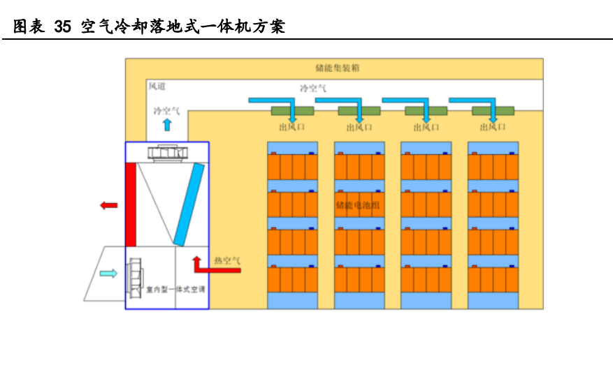 風冷溫控系統(tǒng)一般由儲能溫控廠商直接提供整體系統(tǒng)產品,其中核心部件包括壓縮 機、風機、換熱器等。風冷具備方案成熟、成本低、結構簡單等優(yōu)點,但同時由于空氣 的比熱容低,導熱系數低,風冷一般應用于功率較低場景。