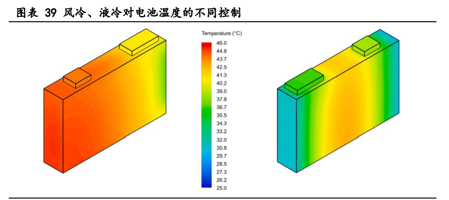 根據(jù) Applied Thermal Engineering 的實(shí)驗(yàn)研究,對(duì)使用空氣冷卻和液體冷卻系 統(tǒng)的電池模塊進(jìn)行比較,使用空氣冷卻的電池的最低和最高局部溫度在 37℃和 45℃ 之間,對(duì)于有液體冷卻的電池,最高和最低溫度在 30℃和 42℃之間??諝饫鋮s和液體 冷卻之間電池的最高溫差隨著功率消耗的增加而減小。每消耗 0.5 W,液冷系統(tǒng)最高 溫度平均比風(fēng)冷系統(tǒng)低 3℃左右。