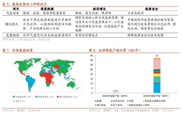 海外各國(guó)加速綠氫布局。脫碳發(fā)展逐漸成為世界各國(guó)共識(shí),超過 130 多個(gè)國(guó)家和地區(qū)提出了碳中和目標(biāo),氫能等新興能源技術(shù)加速推進(jìn),包括日本、德國(guó)、美國(guó)、中國(guó)等在內(nèi)的 42 個(gè)國(guó)家和地區(qū)都已經(jīng)推出氫能政策,36 個(gè)國(guó)家和地區(qū)的氫能政策也正在籌備中。各國(guó)發(fā)展氫能的驅(qū)動(dòng)力分為三大方面:深度脫碳、保障能源安全和實(shí)現(xiàn)經(jīng)濟(jì)增長(zhǎng)。由于電解制氫碳排放低,純度品質(zhì)更高,隨著電解槽成本與可再生能源發(fā)電成本不斷下降,未來(lái)電解制取綠氫有望成為主流制氫手段。各國(guó)在氫能政策中均著重提出要加速布局可再生能源電解制備綠氫,2022 年全球綠氫產(chǎn)能約為 21 萬(wàn)噸/年,預(yù)計(jì)到 2030 年,全球綠氫產(chǎn)能將超過 3600 萬(wàn)噸/年。