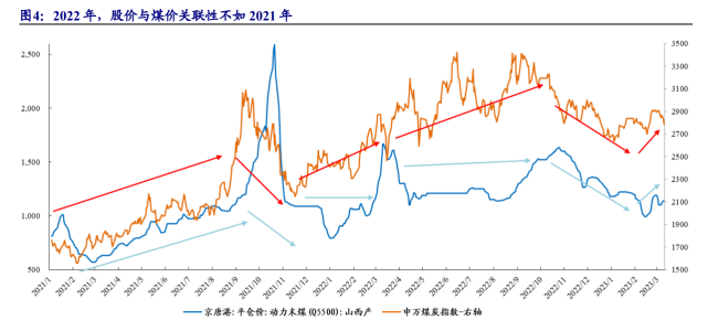 2021年,煤炭行業(yè)經(jīng)歷一輪典型的周期。2021年煤價先漲后跌,股價緊隨煤價波動,周期屬性明顯。1-9月,疫后需求恢復(fù),經(jīng)濟快速增長,煤炭供不應(yīng)求—煤價持續(xù)上漲,股價一路上行;10-12月,政策限價,需求季節(jié)性轉(zhuǎn)弱,產(chǎn)能核增,供給釋放,預(yù)期走弱—煤價下跌,股價回調(diào)。2021年股價與煤價關(guān)聯(lián)性很強,股價基本提前反應(yīng)煤價變化,股價走勢與煤價走勢基本一致。從疫后需求恢復(fù),煤價上漲,到產(chǎn)能釋放,政策限價,煤炭行業(yè)經(jīng)歷一輪典型周期,股價亦先漲后跌。