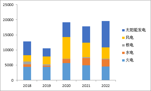 2018、2019兩年新增裝機規(guī)模連續(xù)下滑。2020年,在水電、風電、太陽能發(fā)電裝機高速增長的帶動下,新增裝機容量大幅提升。2021年受火電、風電新增裝機容量減少的影響,整體新增規(guī)模同比出現(xiàn)下滑。2022年,在火電、核電、風電新增裝機增速負增長情況下,太陽能發(fā)電新增裝機容量增速達約60%,拉高全年新增裝機增速。