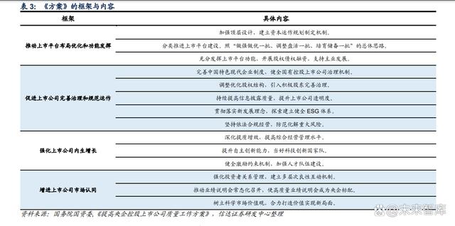 在 2022 年,《國企改革三年行動方案》的收官之年,國資委提出了《提高央企控股上市公 司質(zhì)量工作方案》(下稱《方案》),這開啟了新一輪的央企改革?!斗桨浮访鞔_了提高央 企上市公司質(zhì)量的指導(dǎo)思想和整體思路,要求中央企業(yè)要做好三個(gè)方面的統(tǒng)籌平衡,即堅(jiān)持 做優(yōu)存量與做精增量結(jié)合;堅(jiān)持價(jià)值創(chuàng)造與價(jià)值實(shí)現(xiàn)兼顧;堅(jiān)持依法合規(guī)與改革創(chuàng)新并重。 《方案》從推動上市平臺布局優(yōu)化和功能發(fā)揮、促進(jìn)上市公司完善治理和規(guī)范運(yùn)作、強(qiáng)化上 市公司內(nèi)生增長和創(chuàng)新發(fā)展、增進(jìn)上市公司市場認(rèn)同和價(jià)值實(shí)現(xiàn)等四個(gè)實(shí)施方面,提出 14 項(xiàng)具體工作舉措。