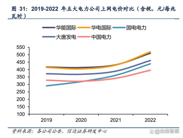 2022 年五大電上網(wǎng)電價(jià)同比上漲明顯,上浮幅度普遍在 18%-20%。2022 年,五大電的煤 電上網(wǎng)電價(jià)普遍實(shí)現(xiàn)上浮,而由于傳統(tǒng)能源裝機(jī)比重較大,2022 年國(guó)電電力和華電國(guó)際綜合上網(wǎng)電價(jià)的上浮最為顯著,其中國(guó)電電力上網(wǎng)電價(jià)達(dá)到 438.88 元/兆瓦時(shí),同比漲幅 21.5%,華電國(guó)際上網(wǎng)電價(jià)達(dá)到 519.25 元/兆瓦時(shí),同比漲幅 20.8%。隨著我國(guó)市場(chǎng)化電價(jià) 機(jī)制的進(jìn)一步完善,電價(jià)上浮空間未來(lái)有望逐步打開(kāi)。
