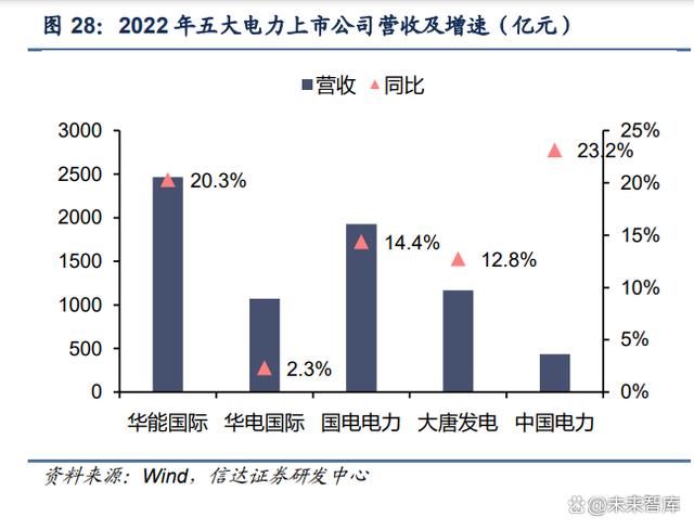 2022 年主要受益于電價(jià)上漲,我國(guó)五大電力上市公司的營(yíng)業(yè)收入均實(shí)現(xiàn)穩(wěn)步增長(zhǎng)。其中, 華能?chē)?guó)際實(shí)現(xiàn)營(yíng)收 2467.3 億元,同比增長(zhǎng) 20.3%;國(guó)電電力實(shí)現(xiàn)營(yíng)收 1926.8 億元,同比 增長(zhǎng) 14.4%;大唐發(fā)電實(shí)現(xiàn)營(yíng)收 1168.3 億元,同比增長(zhǎng) 12.8%;中國(guó)電力規(guī)模較小,營(yíng)收 增速最快,2022 年實(shí)現(xiàn)營(yíng)收 436.9 億元,同比增長(zhǎng) 23.2%。 2022 年五大電盈虧分化明顯,歸母凈利潤(rùn)均實(shí)現(xiàn)向上修復(fù)。2022 年國(guó)電電力(火電資產(chǎn) 優(yōu)質(zhì),長(zhǎng)協(xié)煤基本全覆蓋)、中國(guó)電力(火電資產(chǎn)優(yōu)質(zhì),大力提升新能源裝機(jī)占比)分別 實(shí)現(xiàn)歸母凈利潤(rùn) 27.47 億元、26.85 億元,同比增幅分別達(dá)到 239.6%、297.1%;華電國(guó)際 小幅盈利,實(shí)現(xiàn)歸母凈利潤(rùn) 0.998 億元,同比增長(zhǎng) 102.2%;大唐發(fā)電小幅虧損,歸母凈利 潤(rùn)為-8.71 億元,同比減虧 110.25 億元;華能?chē)?guó)際虧損達(dá) 100.85 億元,同比實(shí)現(xiàn)減虧 25.88 億元。