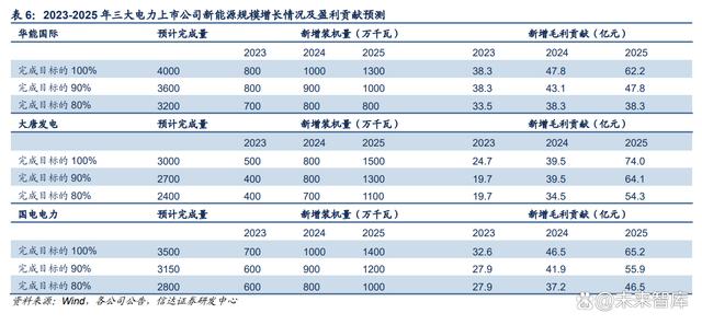 未來(lái)三年新能源裝機(jī)規(guī)模及盈利貢獻(xiàn)有望提速。假設(shè)華能、大唐、國(guó)電三家上市公司未來(lái) 新增的新能源裝機(jī)量中風(fēng)電光伏比例為 4:6,風(fēng)光維持 22 年的發(fā)電小時(shí)數(shù),平均發(fā)電小時(shí) 數(shù)分別為 1770/1841/1731h;平均上網(wǎng)電價(jià) 520 元/兆瓦時(shí);成本收入比為 45%。以完成 “十四五”新能源裝機(jī)規(guī)劃量 90%的情況為例,我們預(yù)計(jì) 2023-2025 年華能?chē)?guó)際新增裝機(jī) 量分別為 800/900/1000 萬(wàn)千瓦,新增毛利貢獻(xiàn)分別達(dá)到 38.3/43.1/47.8 億元;我們預(yù)計(jì) 23-25 年大唐發(fā)電新增裝機(jī)量分別為 400/800/1300 萬(wàn)千瓦,新增毛利貢獻(xiàn)分別達(dá)到 19.7/39.5/64.1 億元;我們預(yù)計(jì) 23-25 年國(guó)電電力新增裝機(jī)量分別為 600/900/1200 萬(wàn)千瓦, 新增毛利貢獻(xiàn)分別達(dá)到 27.9/41.9/55.9 億元。