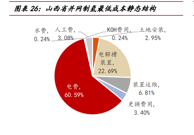 山西省經(jīng)濟利用小時數(shù)為 1915 小時,并網(wǎng)制氫單位成本最低:截止 2022Q3,山 西省風(fēng)電光伏裝機量占比位列全國第 14,但由于負荷較少,山西省低電價小時數(shù)在 五個省份中較為顯著, 0~0.05 元/kWh 共計 1341 小時,0.3~0.35 元/kWh 共計 1219 小時,低電價優(yōu)勢明顯。經(jīng)過我們的測算,當(dāng)利用小時數(shù)為 1915 小時,綜合電價 0. 1868 元/kWh,山西制氫成本最低為 15.2 元/kg,考慮氧氣售后沖減費用,制氫成本 下降至 9.6 元/kg。山西省并網(wǎng)制氫成本結(jié)構(gòu)中,因現(xiàn)貨市場低電價優(yōu)勢顯著,電費 占比相對較低,僅 60.59%,電費之中,電能量價格占 42%,輸配容量價格占 36%。