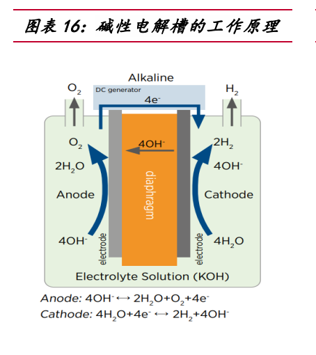 按照工作原理和電解質(zhì)的不同,電解水制氫技術(shù)可分為 4 種。堿性電解水技術(shù) (ALK)、質(zhì)子交換膜電解水技術(shù)(PEM)、高溫固體氧化物電解水技術(shù)(SOEC)和固體聚合物陰離子交換膜電解水技術(shù)(AEM)。其中,堿性電解槽的成本較低,經(jīng)濟性較好,2022 年國內(nèi)堿性電解槽出貨占 97%,但相較于 PEM 的靈活性較差,PEM 受限于質(zhì)子膜高成 本,總體設(shè)備成本是堿性電解槽 3-4 倍。 堿性電解槽的電解液一般為 30%質(zhì)量濃度的 KOH 溶液或者 26%質(zhì)量濃度的 NaOH 溶液。在直流電的作用下,陰極發(fā)生還原反應(yīng),生成氫氣和氫氧根離子,陽極發(fā)生氧 化反應(yīng),生成氧氣和水。經(jīng)過氣水分離器將氣體和溶液分離,電解液回流至電解槽, 氫氣和氧氣分別進入純化裝置提純后進行收集。
