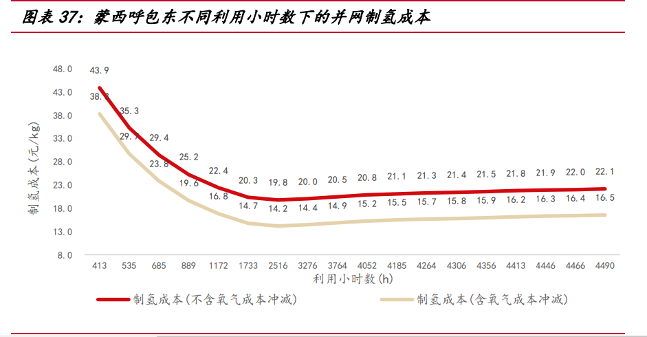蒙西經(jīng)濟利用小時數(shù)為 2516 小時,成本有較大下降空間:蒙西低電價小時數(shù)相 對分散,-0.05~0 元/kWh 共計 408 小時,0.25~0.3 元/kWh 共計 561 小時,整體上并 網(wǎng)制氫成本劣于山西和甘肅省,但優(yōu)于山東和廣東省。當(dāng)利用小時數(shù)為 2516 小時, 綜合電價 0.308 元/kWh,蒙西并網(wǎng)制氫成本最低為 19.75 元/kg,考慮氧氣售后沖減 費用,制氫成本下降至 14.15 元/kg。蒙西并網(wǎng)制氫成本結(jié)構(gòu)中,電費占比 76.84%。 電費之中,電能量價格占 71%,輸配容量價格占 14%。考慮到蒙西有豐富的風(fēng)光發(fā)電 資源,未來風(fēng)光發(fā)電滲透率提升空間較大,電價分布或?qū)⑦M一步左偏,降低并網(wǎng)制氫 成本。