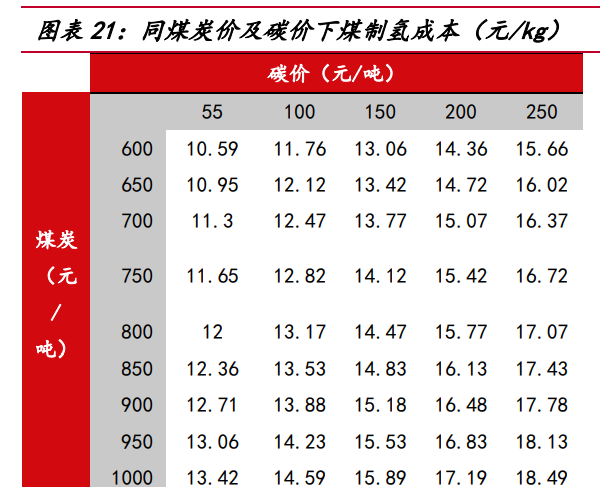 若考慮碳排放價格,化石能源制氫經(jīng)濟性進一步下降。根據(jù) IEA,煤制氫路線 1kg 氫氣產(chǎn)生約 26kg 二氧化碳、天然氣制氫路線 1kg 氫氣產(chǎn)生約 10kg 二氧化碳,按照當(dāng) 前中國碳排放價格為 55 元/噸計算,考慮碳價后煤制氫、天然氣制氫成本將分別達到 12.7 元/kg、22.3 元/kg,在碳減排壓力下,碳配額發(fā)放或?qū)⑹站o,推動碳價上行, 當(dāng)碳價上漲至 200 元/噸時,煤制氫、天然氣制氫成本將分別達到 16.5 元/kg、23.8 元/kg,電解水制氫相對化石能源制氫或?qū)⒏呓?jīng)濟優(yōu)勢。