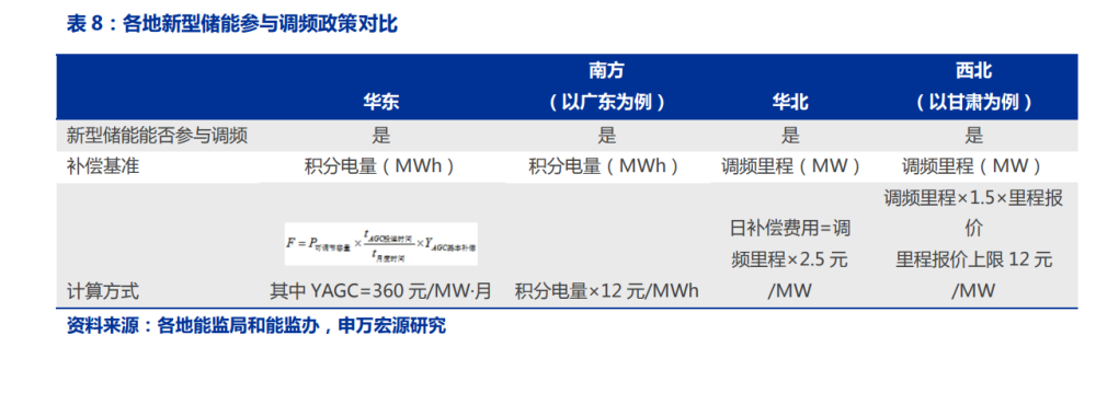 調(diào)頻輔助服務(wù)經(jīng)常因其名稱而讓人迷惑,但調(diào)頻輔助服務(wù)本質(zhì)上還是對(duì)電能量的調(diào)節(jié)。 調(diào)頻輔助服務(wù)理論上就是為了彌補(bǔ)調(diào)頻輔助服務(wù)是為了彌補(bǔ)電力市場(chǎng)和調(diào)峰輔助服務(wù)無(wú)法 解決的實(shí)時(shí)平衡問(wèn)題,主要依靠自動(dòng)控制技術(shù)來(lái)進(jìn)行調(diào)整。 調(diào)頻已經(jīng)成為儲(chǔ)能的重要收入來(lái)源之一。各地陸續(xù)允許新型儲(chǔ)能參與調(diào)頻輔助服務(wù)市 場(chǎng),而目前在多數(shù)地區(qū),調(diào)頻輔助服務(wù)已經(jīng)成為儲(chǔ)能最重要的收益來(lái)源。對(duì)于調(diào)頻輔助補(bǔ) 償基準(zhǔn),華東和南方區(qū)域采用積分電量(即調(diào)頻容量乘以調(diào)用時(shí)間),而華北和甘肅則采 用調(diào)頻里程(即調(diào)頻容量乘以調(diào)用次數(shù))。調(diào)頻補(bǔ)償?shù)挠?jì)算方式并不重要,重要的是看新型儲(chǔ)能參與調(diào)頻輔助服務(wù)相比于火電等傳統(tǒng)機(jī)組是否存在優(yōu)勢(shì)。華東、南方區(qū)域儲(chǔ)能與火 電相比,補(bǔ)償計(jì)算方式?jīng)]有任何區(qū)別。華北區(qū)域同等調(diào)頻里程情況下,儲(chǔ)能的補(bǔ)償費(fèi)用僅 有火電的一半。而對(duì)于甘肅省,補(bǔ)償費(fèi)用則高于火電。