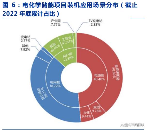 從應用場景看,2022 年儲能應用場景仍以新能源配儲及電網(wǎng)側獨立儲能為主。根據(jù) 中電聯(lián)統(tǒng)計口徑,截至 2022 年底,已投運的電化學儲能電站累計裝機主要分布在電源側, 占比達 48.4%,其次為電網(wǎng)側 38.72%和用戶側 12.88%。2022 年各應用場景新增裝機占 比基本保持不變,電源側占比 49.24%,其次為電網(wǎng)側 43.13%和用戶側 7.63%。從具體 場景看,新能源配儲為電源側主要場景,獨立儲能為電網(wǎng)側主要場景。