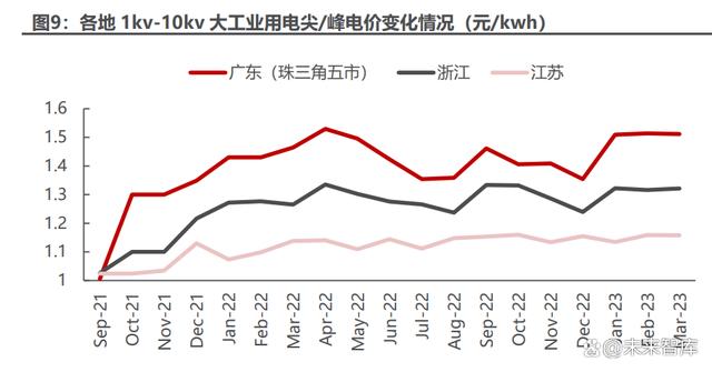 “分時(shí)電價(jià)”、“電力市場(chǎng)化”政策驅(qū)動(dòng),大工業(yè)平均用電價(jià)格提高。2021 年 下半年全國(guó)大部分省份陸續(xù)出臺(tái)分時(shí)電價(jià)政策,調(diào)整峰谷電價(jià)及峰谷時(shí)段,其中以 江蘇、廣東、浙江為例的經(jīng)濟(jì)發(fā)達(dá)省份率先、多次調(diào)整,峰谷價(jià)差有較大幅度的擴(kuò) 大,尖、峰時(shí)段也有不同程度的延長(zhǎng),大工業(yè)平均用電價(jià)格提高。