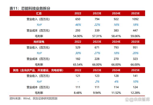 芯能科技業(yè)務(wù)拆分: 22 年業(yè)務(wù)結(jié)構(gòu)收入占比:光伏發(fā)電(81%)+光伏產(chǎn)品(12%)+開發(fā)建設(shè)(4%) +充電樁(1%)+其他業(yè)務(wù)(1%)。其中光伏產(chǎn)品、開發(fā)建設(shè)主要以配套光伏發(fā)電 業(yè)務(wù)為主。 光伏發(fā)電業(yè)務(wù):受益于大工業(yè)電價同比上調(diào)以及公司自持電站規(guī)模持續(xù)擴大、光伏 發(fā)電量穩(wěn)步增加,同時,在分布式光伏整縣推進背景下,EPC 及運維服務(wù)業(yè)務(wù)的市 場空間進一步打開,公司光伏發(fā)電業(yè)務(wù)穩(wěn)定增長。根據(jù)公司轉(zhuǎn)債問詢函回復,未來 三年公司計劃以分布式光伏并網(wǎng)裝機容量不低于 15%的年化增長率持續(xù)擴大自持分布式光伏電站建設(shè)投入,我們預計公司光伏發(fā)電業(yè)務(wù) 23-25 年收入增速分別為 27%/18%/20%。