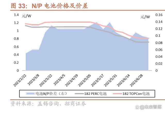 下游接受度躍升。經(jīng)歷 1 年多的市場驗(yàn)證,下游投資方對(duì) N 型優(yōu)勢理解更加深 刻。尤其是雙面率、衰減及溫度系數(shù)等優(yōu)勢帶來的發(fā)電量增益,隨實(shí)際應(yīng)用的實(shí) 證數(shù)據(jù)逐步體現(xiàn),TOPCon 已得到行業(yè)性的認(rèn)可。近期部分招標(biāo)項(xiàng)目 N 型份額 已由此前 10%上下提升至近 50%。2021 年 PERC 市占率約 91%,2022 年降至 88%,而 N 型份額由 2021 年 3%提升至 9%,N 型電池進(jìn)入規(guī)?;瘧?yīng)用階段。 溢價(jià)不斷放大。近期 N 型組件與 P 型組件的價(jià)差,已由 2 月的 0.05 元/W 逐步 攀升至 0.06-0.14 元/W(近期組件報(bào)價(jià)偏分散),整體溢價(jià)逐步放大,原因主要 系隨 N 型產(chǎn)品進(jìn)一步降本增效、電站有效驗(yàn)證的形成,TOPCon 優(yōu)勢不斷驗(yàn)證, 下游對(duì) N 型組件的需求優(yōu)先級(jí)更高,高效組件的議價(jià)能力更強(qiáng)。如果效率繼續(xù)提 升,溢價(jià)有望進(jìn)一步放大。而 TOPCon 電池供應(yīng)相對(duì)緊張,相較 PERC 溢價(jià)由 0.06 元/W 上下爬升至 0.1 元/W。