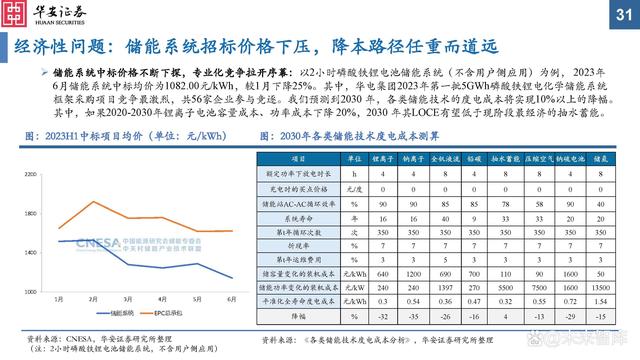 經(jīng)濟性問題:儲能系統(tǒng)招標價格下壓,降本路徑任重而道遠。儲能系統(tǒng)中標價格不斷下探,專業(yè)化競爭拉開序幕:以2小時磷酸鐵鋰電池儲能系統(tǒng)(不含用戶側(cè)應(yīng)用)為例,2023年6月儲能系統(tǒng)中標均價為1082.00元/kWh,較1月下降25%。其中,華電集團2023年第一批5GWh磷酸鐵鋰電化學(xué)儲能系統(tǒng)框架采購項目競爭最激烈,共56家企業(yè)參與競逐。我們預(yù)測到2030 年,各類儲能技術(shù)的度電成本將實現(xiàn)10%以上的降幅。其中,如果2020-2030年鋰離子電池容量成本、功率成本下降 20%,2030 年其LOCE有望低于現(xiàn)階段最經(jīng)濟的抽水蓄能。