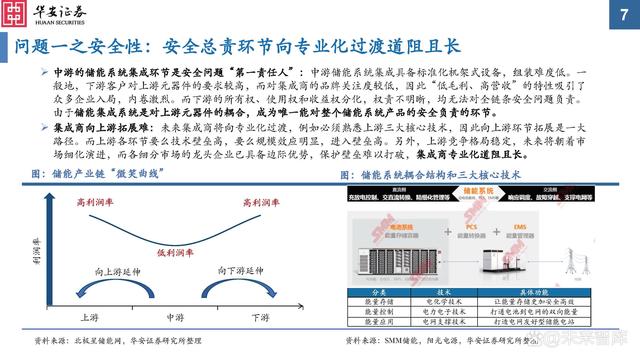 中游的儲能系統(tǒng)集成環(huán)節(jié)是安全問題“第一責(zé)任人” :中游儲能系統(tǒng)集成具備標準化機架式設(shè)備,組裝難度低。一般地,下游客戶對上游元器件的要求較高,而對集成商的品牌關(guān)注度較低,因此“低毛利、高營收”的特性吸引了眾多企業(yè)入局,內(nèi)卷激烈。而下游的所有權(quán)、使用權(quán)和收益權(quán)分化,權(quán)責(zé)不明晰,均無法對全鏈條安全問題負責(zé)。由于儲能集成系統(tǒng)是對上游元器件的耦合,成為唯一能對整個儲能系統(tǒng)產(chǎn)品的安全負責(zé)的環(huán)節(jié)。