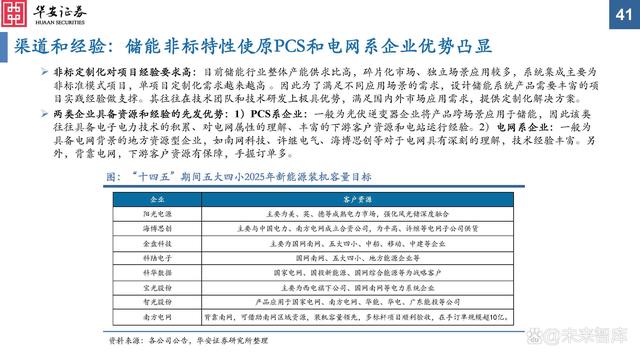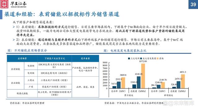 渠道和經(jīng)驗:表前儲能以招投標作為銷售渠道。從下游客戶和銷售渠道來看: 1)表前儲能:采取招投標的方式進行銷售。目前主要市場在國內(nèi),下游集中于to B面向企業(yè)。由于單個項目投資額大、投資回收期較長,一般為電網(wǎng)公司和大型發(fā)電集團等電力系統(tǒng)央企。因此具有下游渠道優(yōu)勢和客戶資源的儲能集成商將率先受益。 2)表后儲能:通過經(jīng)銷與直銷并存的方式向下游終端客戶和經(jīng)銷商進行銷售。市場目前主要在海外,集中于toC端面向大眾消費者,業(yè)務(wù)拓展更多依靠渠道和品牌推廣,儲能集成商是否具備本地化能力是重要因素。